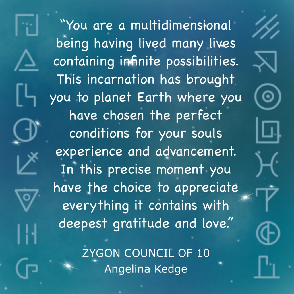 Zygon Messages These messages are channelled from the Zygon Council of 10. They are brought to you to help raise your vibration towards love and light. MULTIDIMENSIONAL BEING